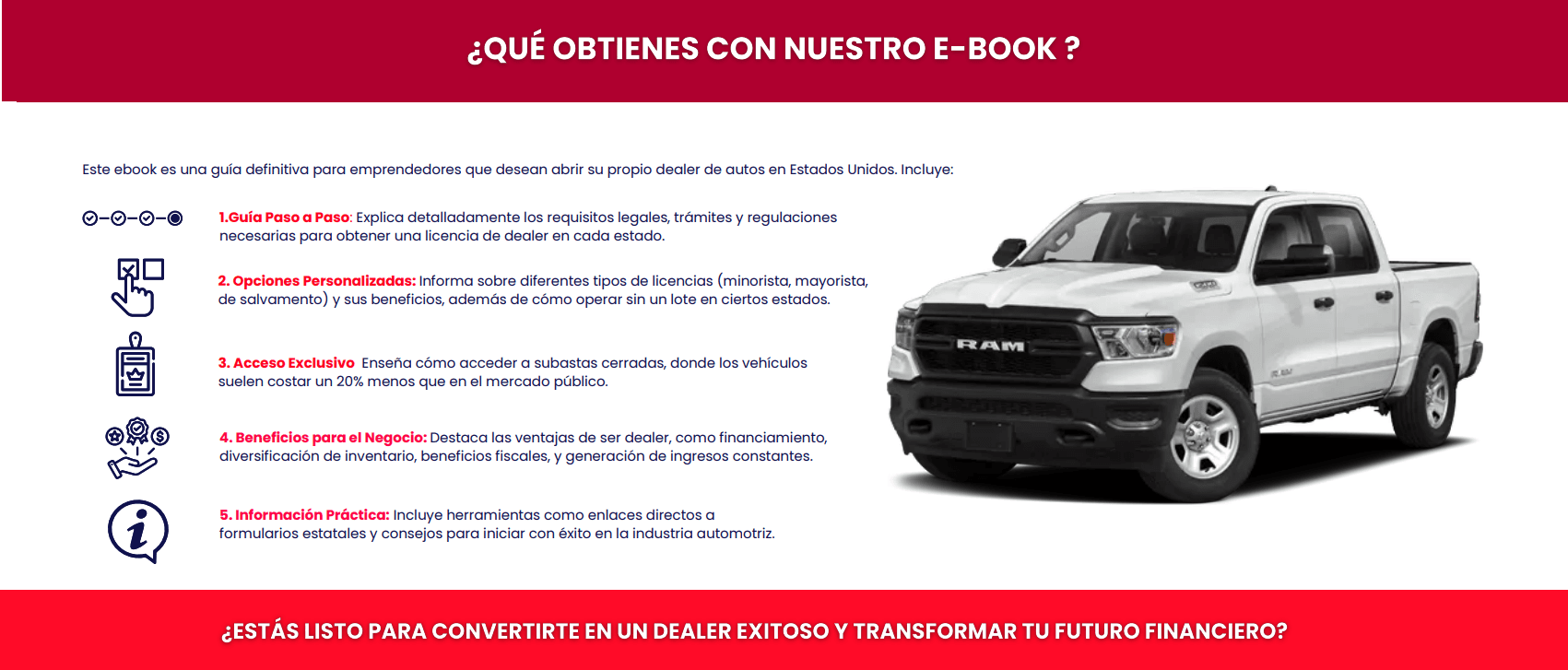 Este ebook es una guía definitiva para emprendedores que desean abrir su propio dealer de autos en Estados Unidos. Incluye: