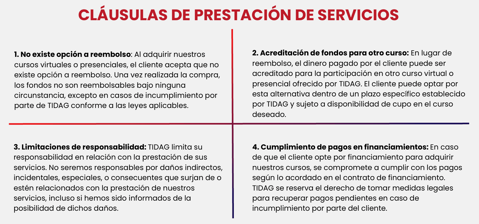 Al adquirir nuestros cursos virtuales o presenciales, el cliente acepta que no existe opción a reembolso. Una vez realizada la compra, los fondos no son reembolsables bajo ninguna circunstancia, excepto en casos de incumplimiento por parte de TIDAG conforme a las leyes aplicables.