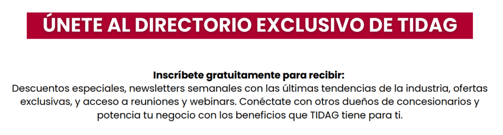 Inscríbete gratuitamente para recibir: descuentos especiales, newsletters semanales con las últimas tendencias de la industria, ofertas exclusivas, y acceso a reuniones y webinars. Conéctate con otros dueños de concesionarios y potencia tu negocio con los beneficios que TIDAG tiene para ti.