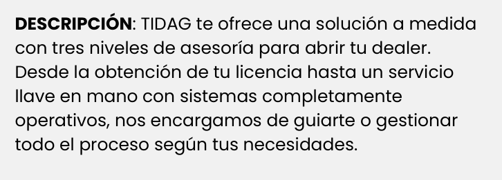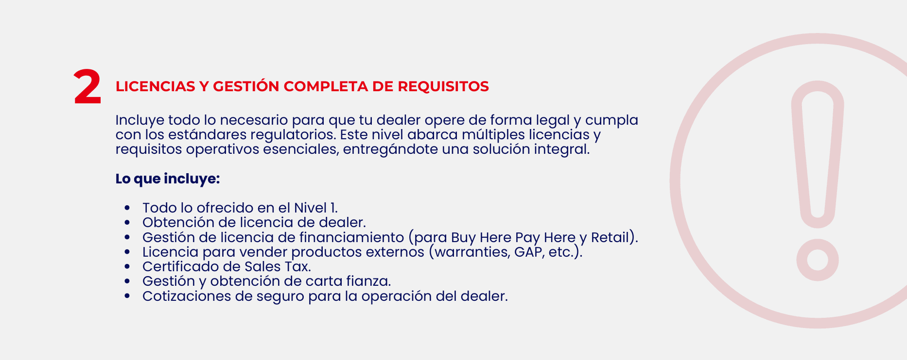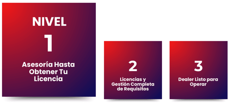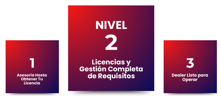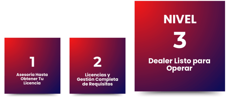 Incluye todo lo necesario para que tu dealer opere de forma legal y cumpla con los estándares regulatorios. Este nivel abarca múltiples licencias y requisitos operativos esenciales, entregándote una solución integral.