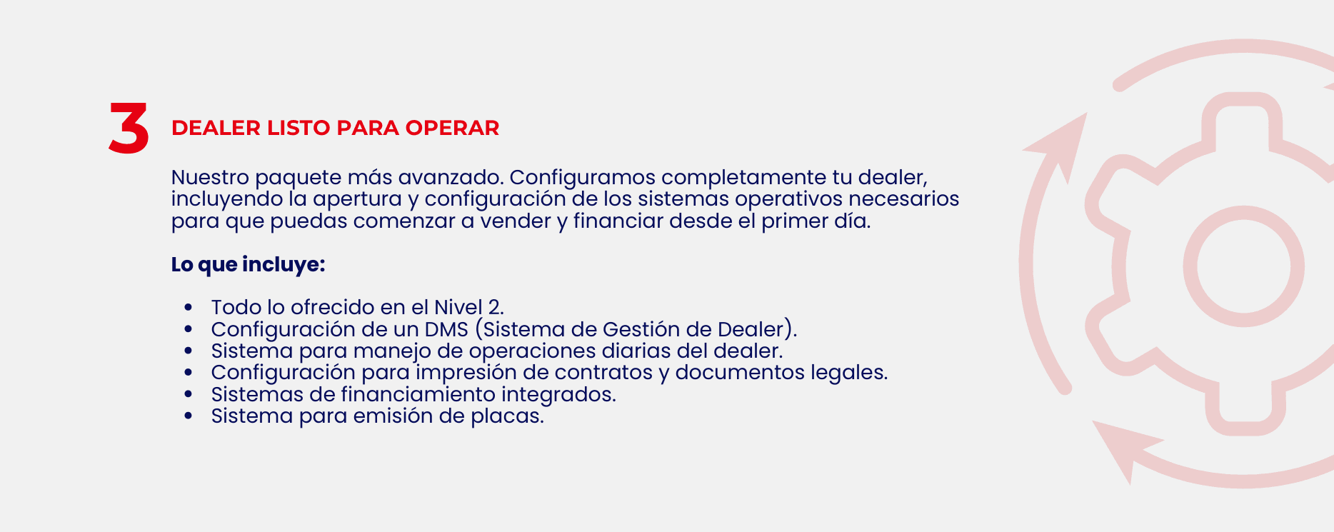Nuestro paquete más avanzado. Configuramos completamente tu dealer, incluyendo la apertura y configuración de los sistemas operativos necesarios para que puedas comenzar a vender y financiar desde el primer día.